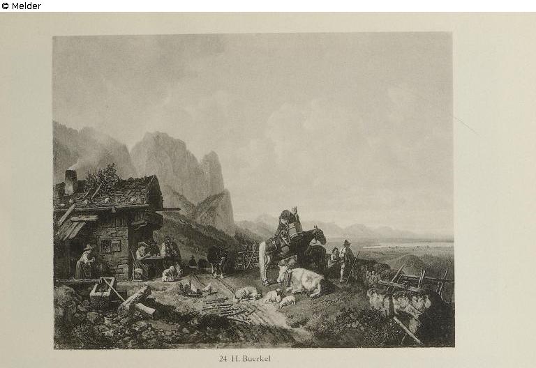 Auktionskatalog Hugo Helbing, München 1931: "Vor einer Alpenhütte rasten Tiroler Bauern. Vor einem Weidezaun ein hochbeladenes Saumpferd stehend, Kühe und Schafe lagernd, ein Bursche und ein Mädel schauen in das weite Land; links im Hintergrund steil auftragende Berge. Goldrahmen"