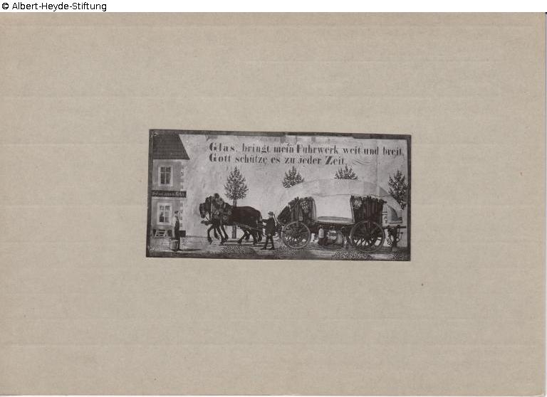 Bild eines schlesischen Glasfuhrmannes, in einem schlichten Rahmen. Zweispänniger, hoch beladener Frachtwagen bei Erreichen des "Gasthofs zum grünen Adler". Ein Knecht bringt Wasser für die Pferde. Oberhalb der Szene die Legende: „Glas bringt mein Fuhrwerk weit und breit. / Gott schütze es zu jeder Zeit“.