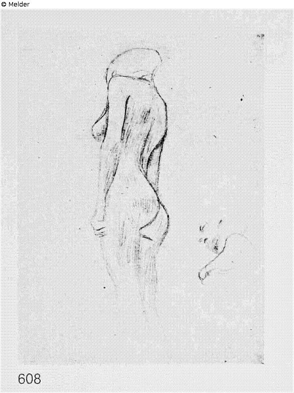 nach Werkverzeichnis Strobl: Fakultätsbild Medizin 1901-1907 (Novotny-Dobai Nr. 112); Für den 1. Zustand 1901 verwendete Studien; Kat. Nr. 606-617; Strobl Werkverzeichnis No.: 608; Titel: Weiblicher Rückenakt nach links, Skizze eines Kopfes