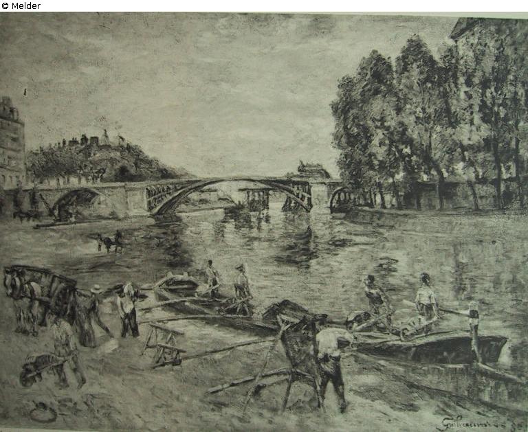 Das Wasser des Flusses spiegelt das Blau und Orange des Himmels. Rechts ein Haus der Insel Saint-louis. Hafenarbeiter mit nackten Oberkörpern entladen ein Schiff am Kai. Im Hintergrund die Brücke de Sully.
