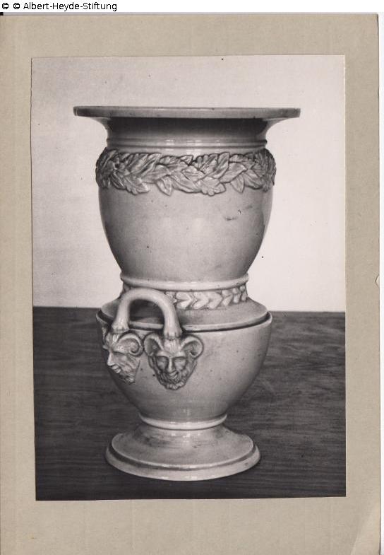 Kombination aus zwei Gefäßen in cremefarbener Glasur. Zuunterst eine Tasse mit Bügelhenkel, deren Enden als Satyr-Maskarons gestaltet. Darauf ein Becher mit ausladender Mündung und umlaufendem, plastischem Blätterfries.