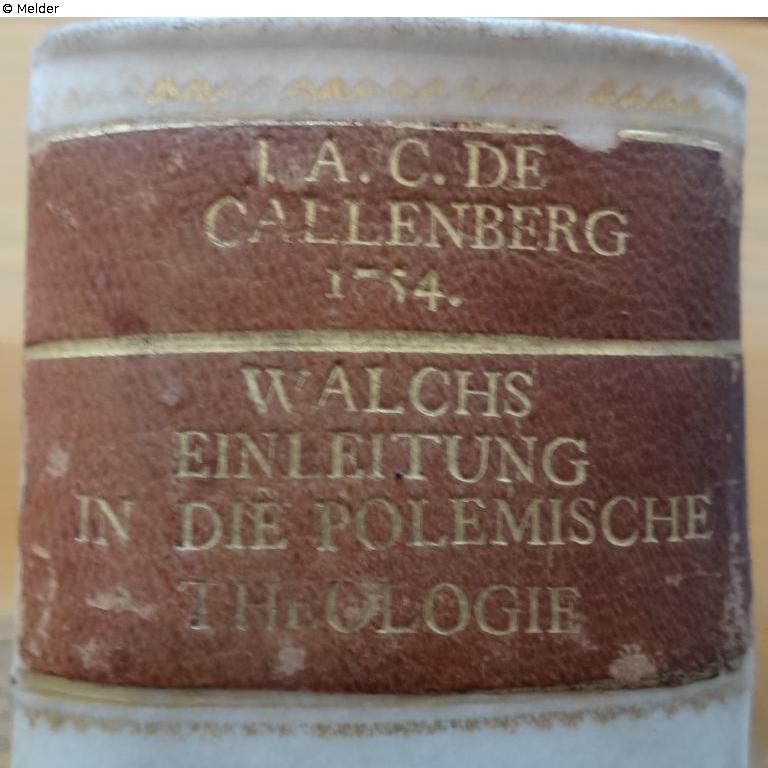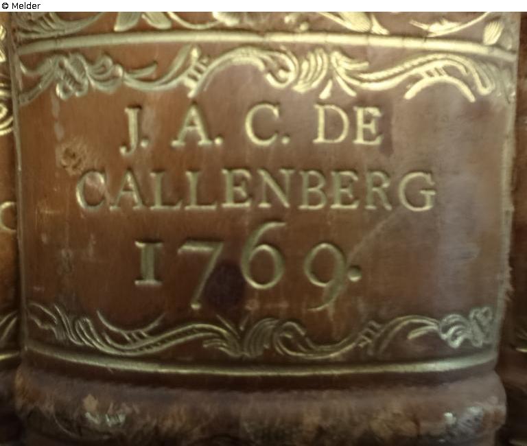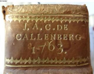 J. A. C. DE CALLENBERG (Johann Alexander Reichsgraf von Callenberg 12.3.1697 - 13.2.1776)goldene Schrift auf weißem oder ursprünglich gelbem (vergilbt) Hintergrund, drei Zeilen mit Jahreszahl und unter dem Trennstrich der Buchtitel