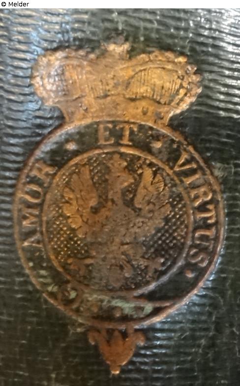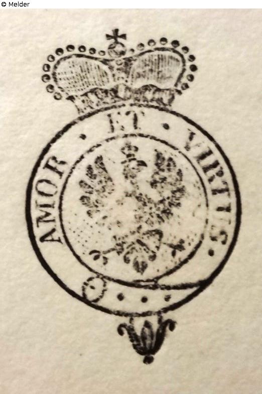 Kreisförmiges Wappen mit Fürstenkrone, im Wappen Adler und umlaufendes Spruchband mit dem Spruch „AMOR ET VIRTUS“Gold, auf verschiedenen Vorlagen