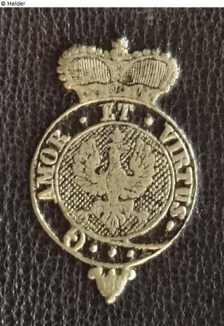 Kreisförmiges Wappen mit Fürstenkrone, im Wappen Adler und umlaufendes Spruchband mit dem Spruch „AMOR ET VIRTUS“Gold oder Schwarz