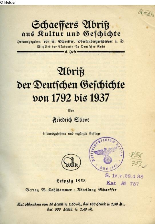 Abriß der deutschen Geschichte von 1792 bis 1937. (4. durchgesehene und ergänzte Auflage). Reihe: Schaeffers Abriß aus Kultur und Geschichte, Heft 6.
