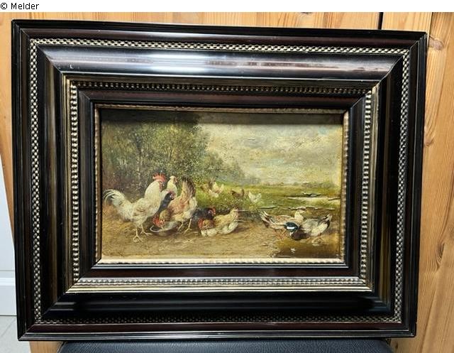 Found-Object Report | Object report Chickens and ducks peaceful Lost Art-ID606784 Previous Next Artist / Creator Hänger, Max (d. Ä.) Birth 1874.03.19, München Death 1941.09.04, Fürstenfeldbruck Place of activityMünchen; Eichenau TitleChickens and ducks peacefulObject typePaintingGroup of reported objectsPaintingMaterial / TechniqueOil ; Canvas / painted Height 18.70 cm Width 30.00 cm Description The depiction shows several ducks, cocks and a rooster in a meadow bordered by trees and bushes. Verso:1872 x 30 (in blue pencil); 400,- (in pencil; probably price in marks); £. 2065,- (with blue pencil; presumably pounds). Read more Read less Provenance Privat property Read more Read less Published since22.12.2022 Contact Please contact the German Lost Art Foundation.