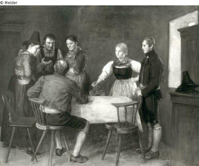 Group of figures in a farmhouse parlour. In the centre of the painting is a table with a white cover. Six people are gathered around it, including a seated man on the left side of the table in a back view, and behind him two peasant women and a peasant who, facing each other, are engaged in a lively discussion. On the right edge of the table is a young couple looking over at the older ones. In the background on the left is a door, on the right edge of the picture a window. In front of it is a chest of drawers on which a hat is lying.