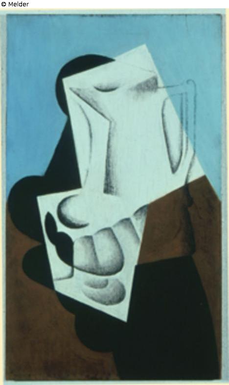 On wood (as picture support) above handwritten: "G", below in white chalk: "M. J oder /?", below handwritten: "No. 5000" (crossed out with blue colour), below handwritten in blue: "No. 8" behind it possibly "12", above left covered by stretcher a sticker with jagged blue border and a red unidentifiable number, above right covered by stretcher a sticker: still visible: "12. 02-24.03.1958 Cat.No. 10 Kahnweiler / 17/18 Old Bond Street London W1" (address of Marlborough Fine Arts), on the top right of the frame a white rectangular sticker: “Bayerische Staatsgemäldesammlungen / München / Gemälderahmenprotokoll Nr. 45-02”.