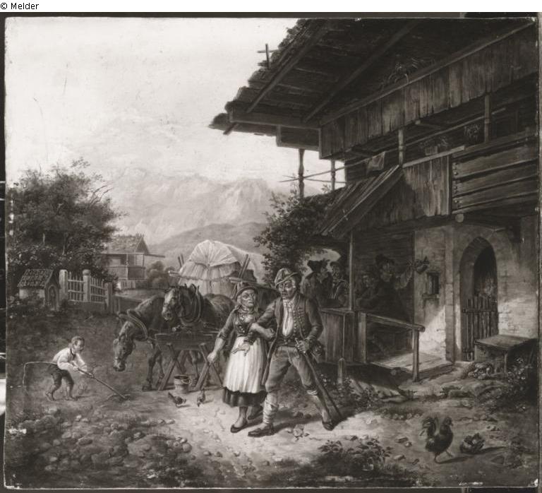 Farmer couple in front of the tavern