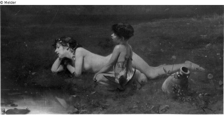Found-Object Report | Object report Girl lying by a pond with gypsy boy Lost Art-ID218861 Previous Next Artist / Creator Piglhein, Bruno Birth 1848.02.19, Hamburg Death 1894.07.15, München Place of activityMünchen TitleGirl lying by a pond with gypsy boyObject typePaintingGroup of reported objectsPaintingMaterial / TechniqueOil ; Canvas / painted Height 70.50 cm Width 140.50 cm Inventory numbermü10689Description Signatur: Piglhein;Der Weiher links; das nackte Mädchen liegt und schaut in den See. Davor ein hockender Knabe. Rechts ein Krug. Read more Read less Holding Kulturgüter aus dem ehemaligen ReichsvermögenPublished since2001 Contact Kunstverwaltung des Bundes Herbert-Bayer-Straße 5 13086 Berlin Germany E-Mailprovenienzforschung@kvdb.bund.deHomepagehttp://www.kunstverwaltung.bund.de