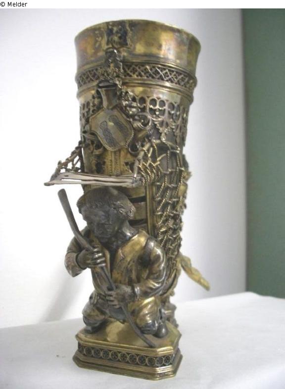 On the front, the coat of arms of the Vintler family from Bozen, with a gilded silver figure of a grocer below.