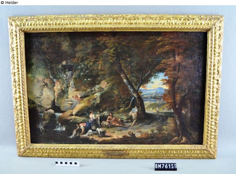 Landscape with different figures. In the foreground women washing their clothes. On the left side a rock with a waterfall. Through the leafy trees on the right side view to a place with a church tower. On the back with yellow chalk written the auction number of Hans W. Lange (69) and remains of two old labels. At the top of the ornamental frame two more numbers written with chalk, probably 327 and 200. Counterpart to BM00761/ST.