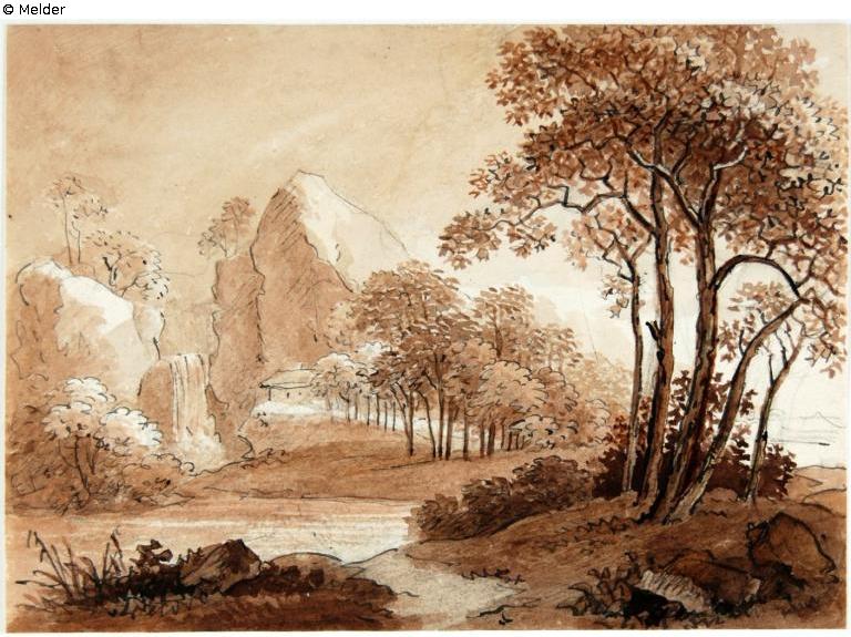Ideal landscape with ponds, trees and hut in front of rocks