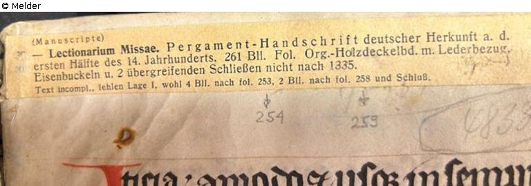 1 volume (262 sheets); 31.5 x 23.5 cm; parchment manuscript of German origin from the first half of the 14th century; original wooden cover with leather binding and iron bosses.
