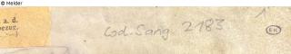 On fol. 1: stamp "EK" in ellipse, handwritten in pencil "Cod. Sang. 2183", pasted note from auction catalogue Karl and Faber Art and Literature Antiquarian Bookshop