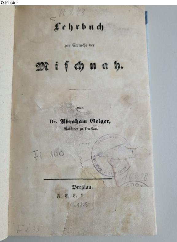 Found-Object Report | Object report Lehrbuch zur Sprache der Mischnah Lost Art-ID632699 Previous Next Author Geiger, A. TitleLehrbuch zur Sprache der MischnahPlace of releaseBreslau Date of publication1845Object typeBookGroup of reported objectsLibrary objectsSignature1207/Fi 100Description stamp "Reichsinstitut für Geschichte des neuen Deutschlands" (A273/16928 ). Read more Read less Provenance Previous owner's name may be covered on the title page Read more Read less Published since28.10.2025 Contact Ludwig-Maximilians-Universität Institut für den Nahen und Mittleren Osten Bibliothek Veterinärstr. 1 80539 München Germany Phone0049-89-2180-3039Homepagehttps://www.naher-osten.uni-muenchen.de/institut/bibliothek/index.html Contact Prof. Dr. Ronny VollandtPositionProfessor für JudaistikE-Mailronny.vollandt@lmu.de