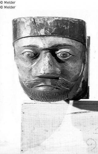 Male head carved in wooden beam