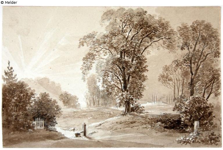 Park landscape with rising sun