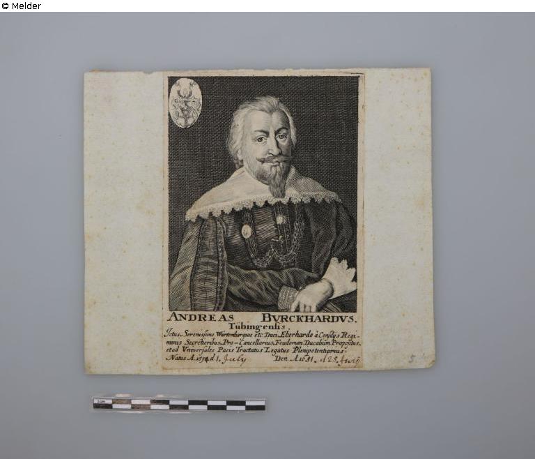 Inscription: "Andreas Burckhardus Tübingensis, Icuts Serenissimo Würtembergeae etc. Duci, Eberhardo à Consitys Regiminis, Secretioribus, Pro-Cancellarius, Feudorum Ducatium Prapofitus, etad Vniversales Pacis Tractatus Legatus Plenipotentiarius. Natus A. 1594 d. 1 July Den. A. 1651. d. 25. Juny".