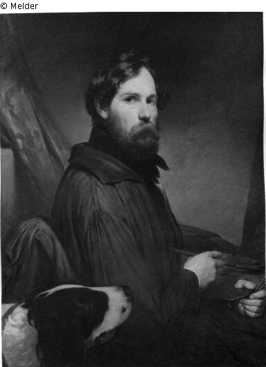 Signatur: F.v.Amerling 1843 Rom; Der Maler nach re. aus Bild schauend, in li. Hand d. Palette, in re. Pinsel. Links unten Hundekopf.
