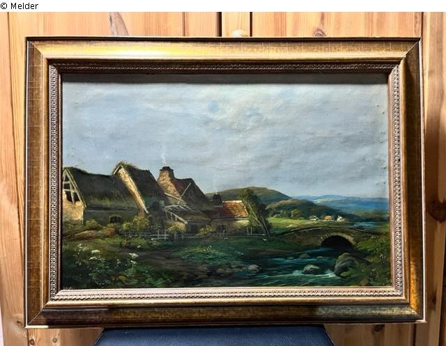 In the centre of the picture, village houses and a small bridge over a river are depicted. In the background more houses and mountains are visible.