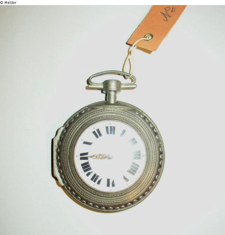 So genannte Bauerntaschenuhr mit Übergehäuse aus Schildplatt und breiten römische Ziffern in schwarz. Schlüsselaufzug an der Rückseite. Auf der Werksplatine Signatur "Johann Einberger a Lauffen" und gefasster roter Lageredelstein mit Wappenszene. Herstellungsort: Lauffen (Neckar)