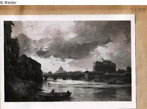 Pictured center, view on Tiber with four arch stone bridge. Left buildings with Street. On the shore a boat with stakendem ferryman and passenger in the bow. Right Castel Sant'Angelo, in the background the dome of the Pope's seat.