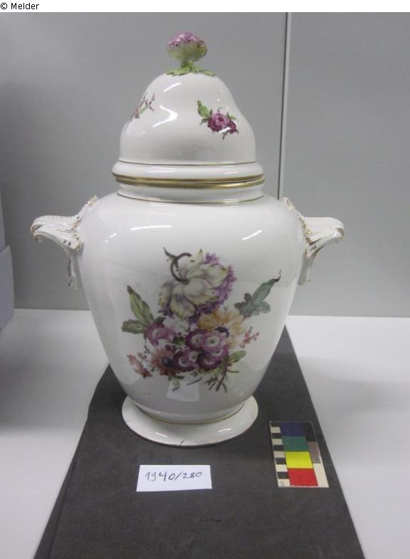 The lidded vase with shell handles and floral decoration was made by the Fürstenberg porcelain manufactory. The smooth body of the vase, on which the painting is shown to its best advantage, is typical for the late 18th century.