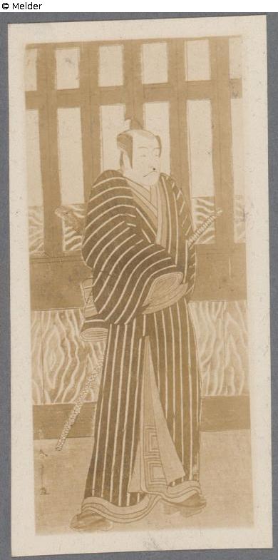Actor Ishikawa Danjuro standing in a black and white striped kimono with a long sword in ray skin, scabbard and flute, which he is holding on his back. Latticework with grained wood in the background. Signed. Hosoye (narrow picture, upright format)
