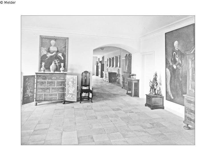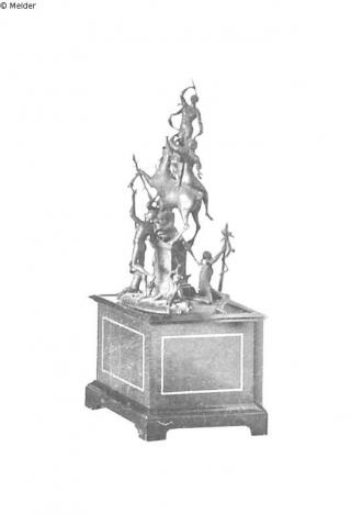 The overall structure is as follows: On an oval-round plate in the centre an apparently oval-rectangular plinth of waist height with relief panels on the sides, on which a muscular male figure is seated and a horse carrying two figures rears up. One of these figures is seated on the back of the horse's back with her leg splayed out, holding a tool-like object in her right hand; opposite her and held by her with her left hand is a naked, or scantily clad, female figure standing on the mount, raising one arm, holding the other to the side and entwined by a fluttering ribbon. Grouped on the ground around the base are an unclothed, walking male figure holding a staff and appearing to eye it, a child sitting on the ground with his legs apart, a female figure sitting on the ground with her arm raised holding a spear or lance from which a ribbon hangs down, and apparently another figure and some accessories lying on the ground.