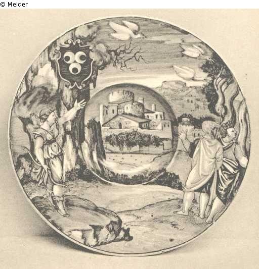 A BRILLIANTLY PAINTED URBINO ARMORIAL TONDINO, by Fra Xanto Avelli, with the " Strozzi " arms, painted in the sunk centre with a moated castle, on the left Diana, three white swans in the sky above and two figures to the right; the subject taken from the History of Troy ; the reverse with yellow borders and inscribed in black " Trojanosque vagos libicas expellit in oder as. 1530, X. "