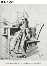 The artist's sister, reading, sitting at a table. Upper right the head repeated, slightly sketched. Inscribed below: Hans Thoma 7 July 63