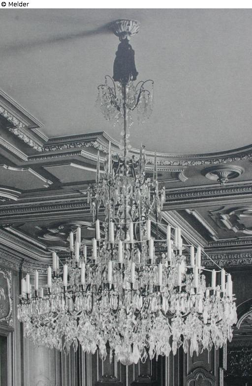 Dresden Castle, 1st floor north wing, Hall of Mirrors; In inventory list no. 1 dated 31 January 1920, as part of the settlement agreement between the Free State of Saxony and the former royal family of 1924, a large electric bronze chandelier with glass pendants and 66 candles is listed for the Hall of Mirrors, which was purchased by the state; An exact date of removal is not on record. The measures were completed in the summer of 1944. The chandelier was probably removed on April 26, 1944 and taken to the relocation site at Rammenau Castle. Nothing is known about the circumstances of the loss of these objects. It is assumed that they were lost in connection with the events of the Second World War.