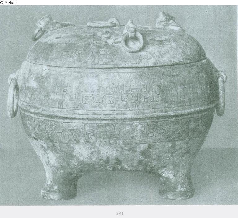 Zwei T`ao-t`ieh-Masken mit Ringen als Henkel. Auf dem deckel drei liegende Einhorne mit Ringösen. Friese von verschlungenen Drachen und Innenzeichnung von Spiralmustern in Flachrelief. Teilweise rostrote, teilweise grüne Patina. Sogenannter Huai- oder Ts`