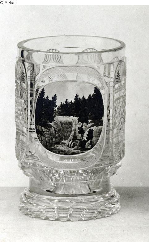 Relief diamond cutting and enamel painting. "Waterfall". 6 fields with half rosettes and relief diamond cut, foot contrasted by lobes.