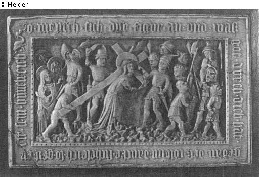 in the centre of the picture field, Christ, turned to the right, on his shoulders the cross, whose longitudinal beam supports Nicodemus. on the right and left soldiers, some of whom are mocking the Lord. On the far left the two Marys and John. The background is net-like, neutrally patterned. On the border strips: ‘o Mensch sich diese figvr an vnd was god dvrch dich hat gedan deß soltim dancke sich`eleich so geit dir sein himelreich’, no traces of colour, alabaster, high relief, 17 x 27 cm.