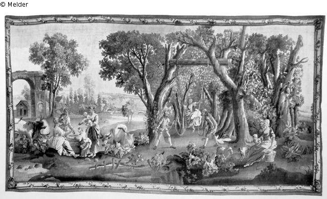 rechts unter hohen Bäumen Mädchen auf Schaukel mit zwei Kavalieren, links Landschaftsausblick, davor ländliche Figurenszene. Braune Einfassung in Form einer Rahmenleiste, umwunden von bunter Blumengirlande.