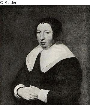 Bildnis einer Frau in mittleren Jahren mit schwarzer Kappe, dunklem Rock, einfachem breitem weissen Kragen und Manschetten, die Händen ineinandergelegt. Goldener Rahmen.