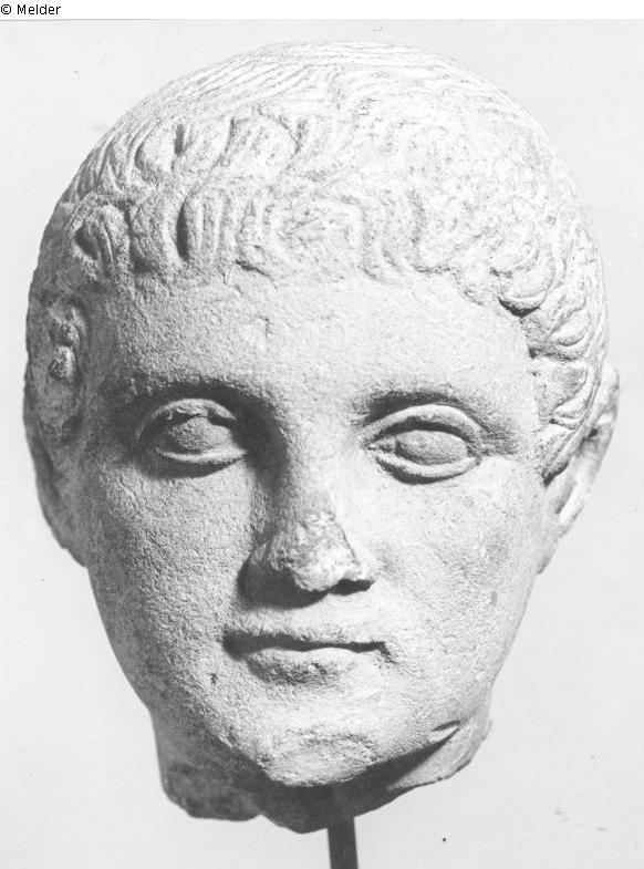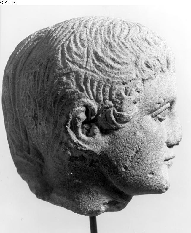 Head of a boy with curls lying forward against the head; condition: slight chipping on the nose, chin and forehead.