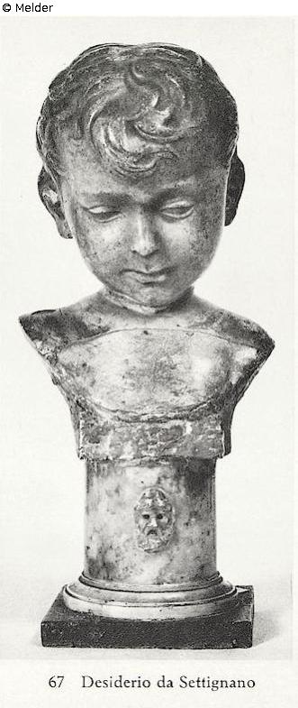 En face, head slightly moved forward. Slightly curled hair with forelock, smiling lips, looks down. Gesson, tinted and darkened. On pedastal of marble. (Was maybe later worked as a bust. Repaired at neck) H. without pedestal 22 cm, H. with pedastal 31 cm. See the infant Jesus at the tabernacle of Desiderio da Settignano in San Lorenzo, Florenz. See similar figures at the Louvre, Kaiser-Friedrich-Museum, previously collection Kauffmann, Berlin etc. Source: Hugo Helbing Kunsthandlung and Kunstversteigerungshaus: Kunstbesitz eines Berliner Sammlers. Katalog Nr. 49.