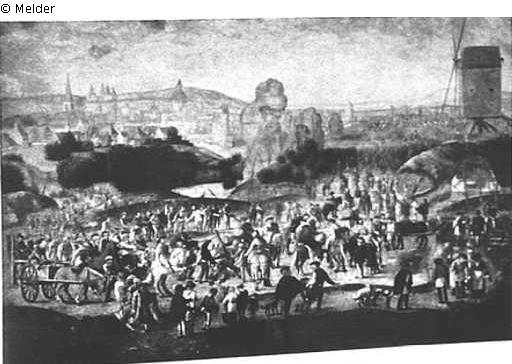 Der Vordergrund, eine wellige Landschaft, übersät mir einen bunten Gewimmel von Menschen und Kriegern zu Pferd und zu Fuß. Links der Mitte Christus unter dem Kreuz zusammenbrechend. Rechts Haus, dahinter Windmühle und in der Ferne Golgatha. In der Mitte des Hintergrundes zerklüfteter Felsen, links Ansicht einer befestigten Stadt. Grünlicher Himmel. Goldrahmen.
