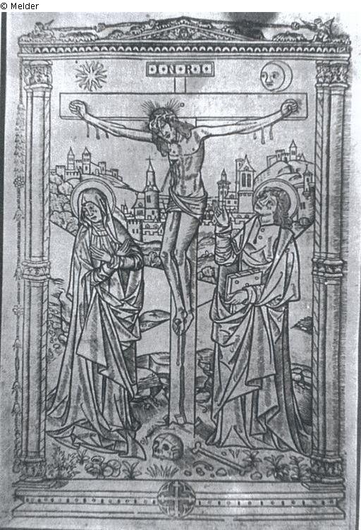 Within a columned frame with pediment the crucifix, under his arms on the left Mary looking down weeping and clasping her hands together over her breast, on the right John looking up weeping and pointing with his right hand to the crucified. In the background towers and walls of Jerusalem, metal cut from a book of hours.