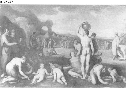 Panel painting: Depiction: the manna is gathered in baskets and pots; gather; basket; pot; signature: at the bottom in the centre: CvH (joined); dimensions: 57 x 80 cm