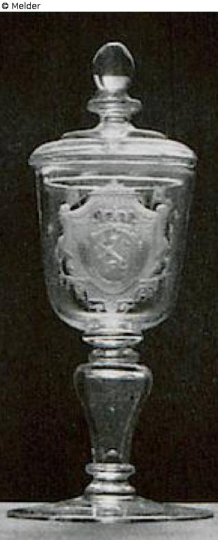 Wheel-engraved. At bowl the English emblem, behind the Netherlandish lion inside a cartouche with crown on top underneath a canopy. Hollow baluster-shaped stem. The foot at bottom with wheel-engraved frieze of leaves. Holland, beginning of 18th century. Literature: Auktionskatalog Hans W. Lange, Wertvolles Kunstgewerbe, Berlin, 19.-21. Mai 1941, S. 62. Nr. 257, Taf. 39 (DOI: external link)