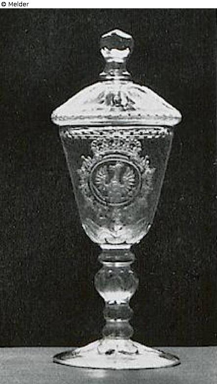 At bowl Prussian eagle with name F W R at chest, inside a round frame with crown on top, that is surrounded by the collar of the order of the black eagle. Shiny bead trim; at lower part, knob and foot matt friezes of peaked leaves. The cover doesn't belong to it. Potsdam, around 1720. Literature: Auktionskatalog Hans W. Lange, Wertvolles Kunstgewerbe, Berlin, 19.-21. Mai 1941, S. 63. Nr. 263, Taf. 42 (DOI: external link)
