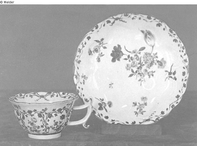 Saucer in gadroon molding, eight-lobed rim. The underside decorated equally as the exterior of the cup. The inner rim like the inner rim of the cup. On the well a bouquet of polychrome German flowers and scattered flowers.