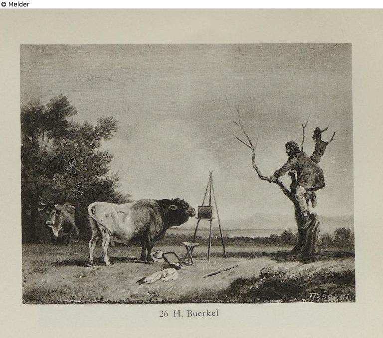Auction catalogue Hugo Helbing: ‘A powerful bull has approached the easel of a painter; while the latter has fled to a tree, the bull sniffs at the picture; behind him a cow. Gold frame’