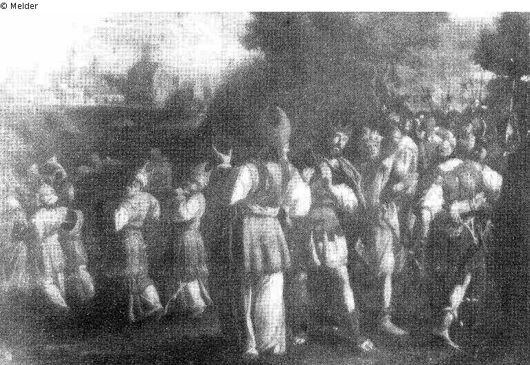 In a landscape with thick trees to the left and the panorama of a large town to the right, are King David and Sadok the priest. To the right are Levites, carrying the shrine.