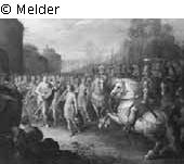 David approaches the city gate where he is received by the playing and singing virgins; behind him, captains on horseback can be seen.