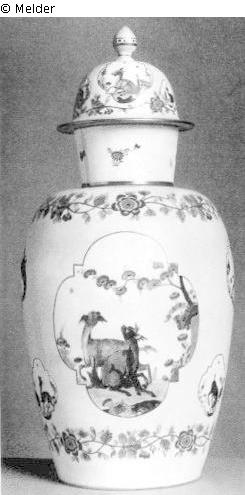 A.R., eiergelber Fond mit Reserven und Tier; Quelle: Rudolf Simonis: Inventory of the Art Collection of Hermine Feist-Wollheim, undated. In: Leo Baeck Institute, New York. AR 7019 / MF 551. Series XIV: Varia, undated, 1700s-1922. Box 9 Folder 10. Großes Esszimmer, Vitrine, Nummer 494;